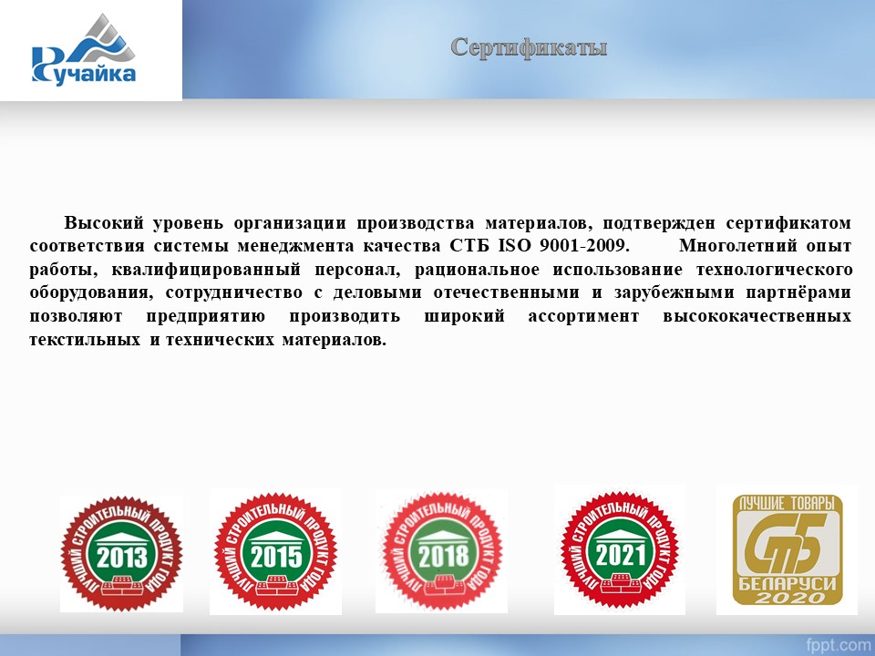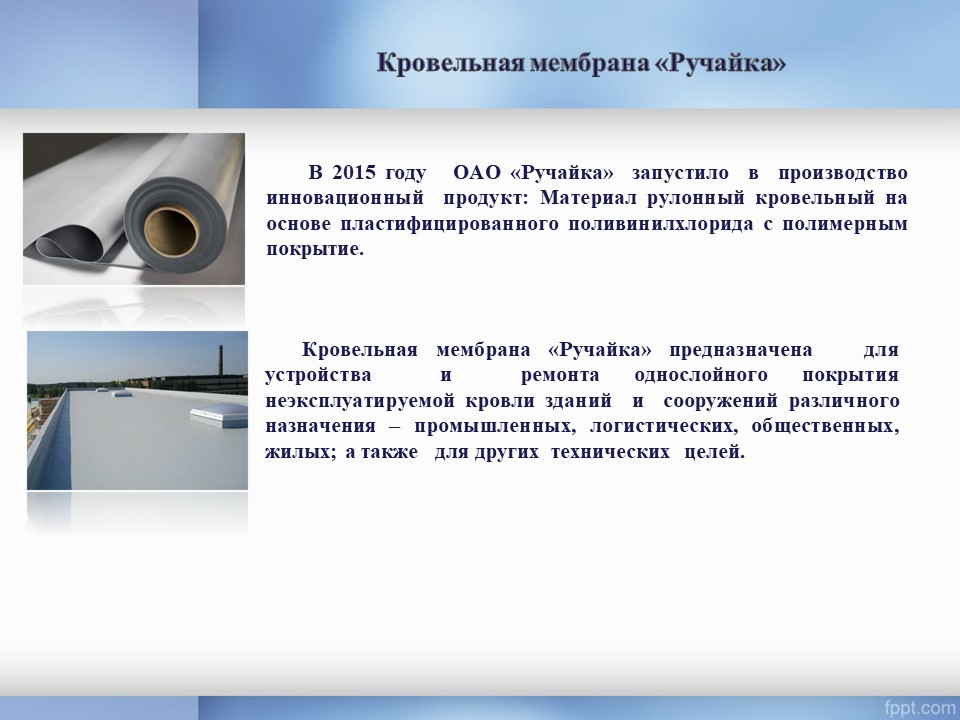 Дахавая мембрана "Ручайка" – гэта армаваны поліэфірнай тканінай матэрыял з трохслаёвым нанясеннем ПВХ кампазіцыі, пакрыты лакам. Прызначаны для прылады і рамонту аднаслаёвага пакрыцця неэксплутаваныя даху будынкаў і збудаванняў рознага прызначэння: прамысловых, грамадскіх і жылых, а таксама для гідраізаляцыі наземных сховішчаў, пакрыццяў рэзервуараў і іншых тэхнічных мэтаў.
